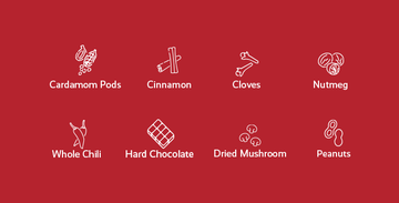 SPICES: Cardamom Pods, Cassia, Cinnamon, Cloves, Dried whole chilli, Nutmeg, Pumpkin seeds, Sunflower seeds, Star anise, Tonka beans